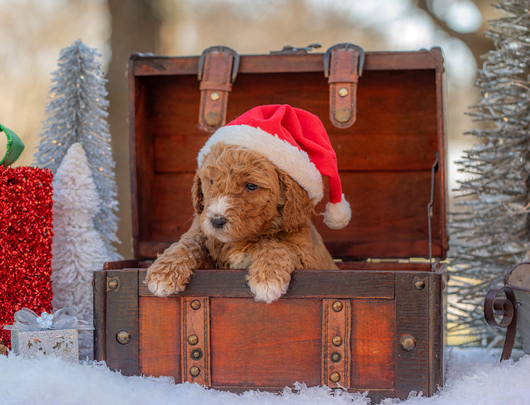 Meet Bella, a premium F1-B Goldendoodle with a timeless look and a calm, affectionate personality. She has a tight, curly dark rust coat with crisp white markings on her chest, nose, and toes, finished off with an adorable teddy-bear face.