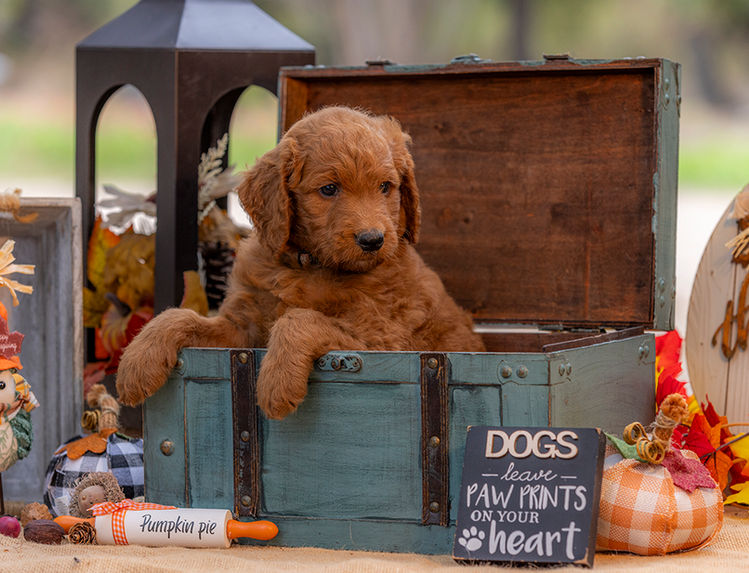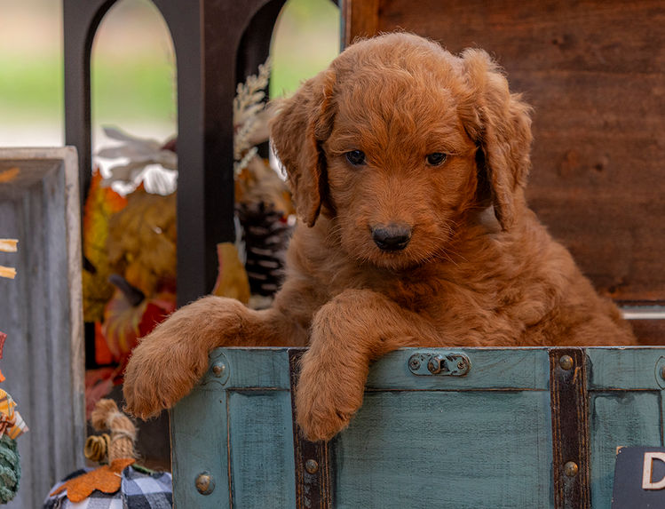 Meet Bentley, our premium, medium sized F1 Goldendoodle! This adorable little fellow sports a soft, fluffy coat of rich dark red fur that’s simply irresistible. Bentley has been showered with love from day one, making him a gentle and affectionate companion, perfect for families or individuals alike. He’s already an expert snuggler, thanks to the endless cuddles he gets from our whole.