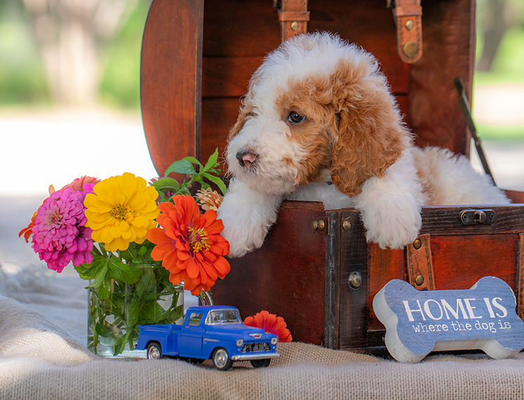 Say hello to Max, a premium F1-B Goldendoodle in a perfectly sized package. His luxuriously, curly-white coat is beautifully patterned with warm rust-colored patches that frame his eyes and ears like a masterpiece, with additional splashes dancing across his body. With his dapper coloring and teddy bear curls, Max is equal parts charming and unforgettable.