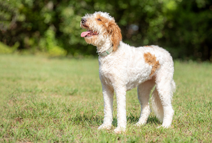 Molly is a full-sized F-1 Goldendoodle. She has a beautiful curly white coat with dark red markings on her faces and on her sides, she has little red "freckles" throughout her coat as well. She has the tight curls a Goldendoodle is known for. She loves to fetch a ball or play with our children or our other dogs. She is a happy, loving girl. We are so happy to have found this distinctly marked F-1 Goldendoodle mama. We have had her since she was a little pup, and she has grown up so quickly and turned into a wonderful young lady.