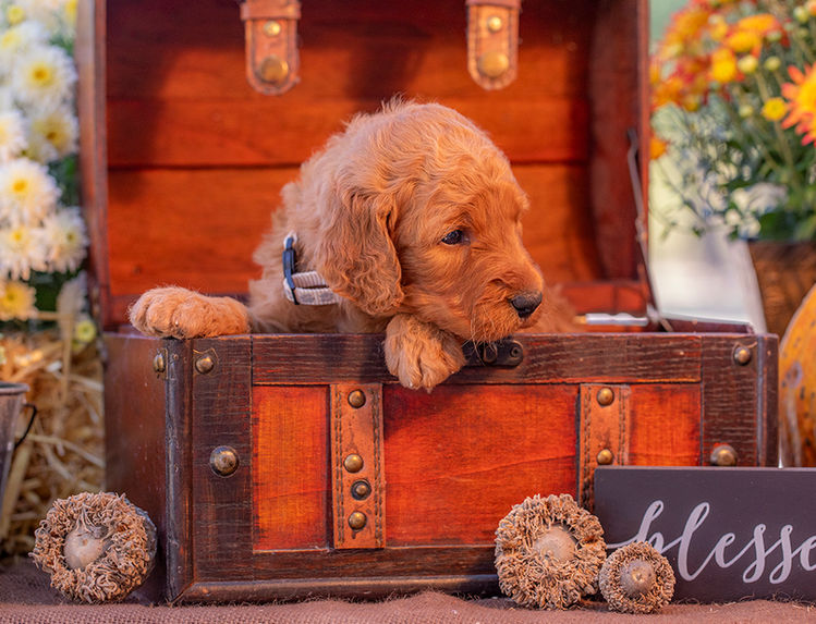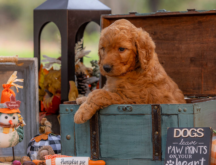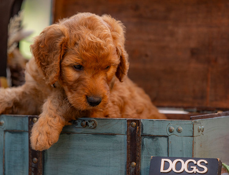 Meet Teddy, our adorable medium-sized F1 Goldendoodle! This little charmer features a gorgeous rusty red, curly coat that’s sure to turn heads. But it’s not just his good looks that make Teddy special—his sweet, gentle personality shines just as bright. Teddy loves to snuggle and shower you with kisses, making him the ultimate cuddle buddy. Surrounded by love and attention from day one, he’s already mastered the art of affection, thanks to endless snuggles from our kids.